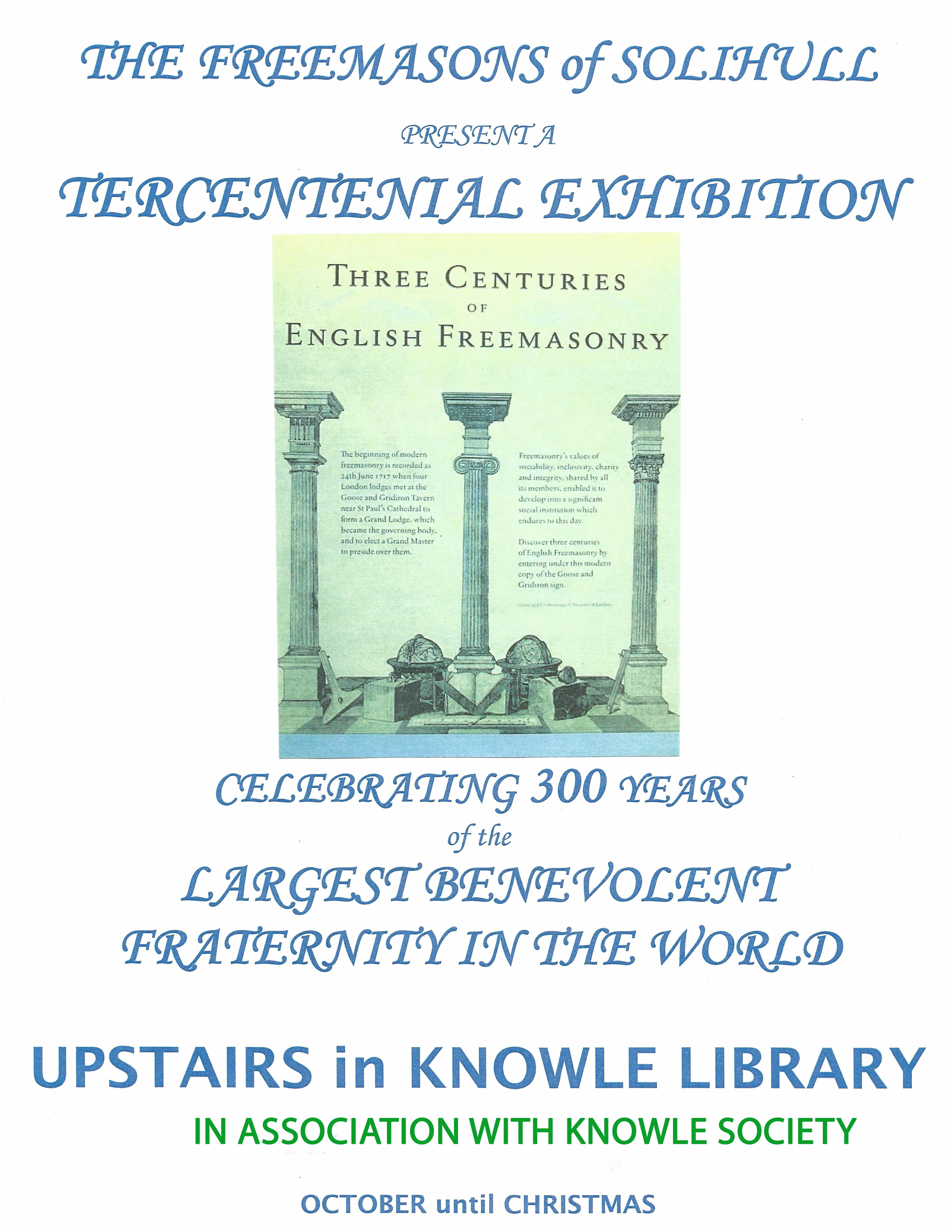EXHIBITION OF 300YRS OF FREEMASONRY7 November 20177 November 2017Local HistoryTo mark this historic occasion, Knowle Society has handed over its exhibition space in Knowle Library to a display of masonic ephemera and historical landmarks, especially some relating to Freemasonry and Knowle. Post Views: 1,825 previousKNOWLE STARTS THE COMMEMORATION OF REMEMBRANCE DAYnextTREE FELLING ON THE DEVELOPMENT AREAS