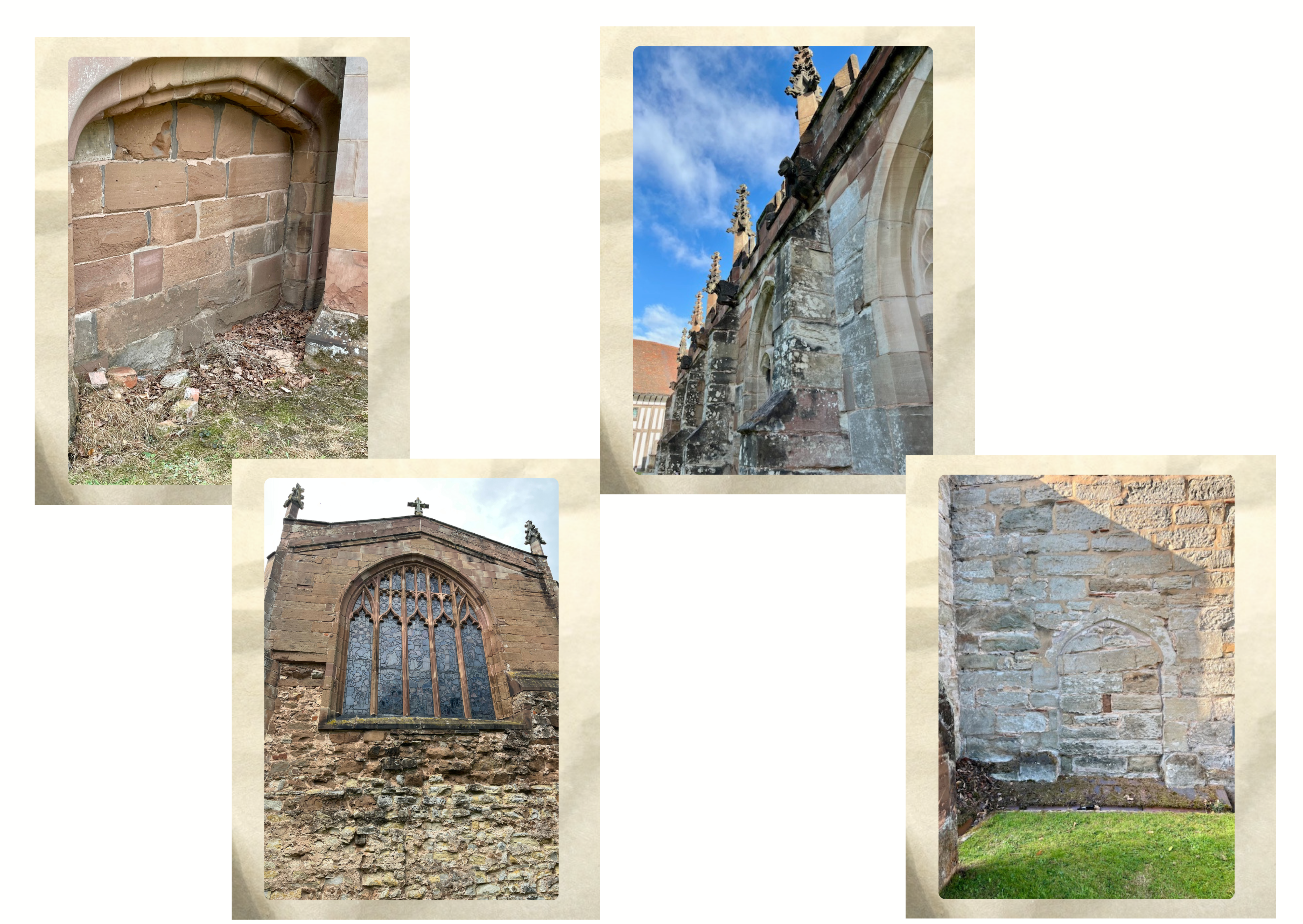 Around 1830 the former South entrance to the church [visible on the photograph] was removed and replaced with a new window and reconstructed wall. Though very, you can note slight differences between the new window and the four original south aisle windows. The bricks of the new wall can be seen under the new window.