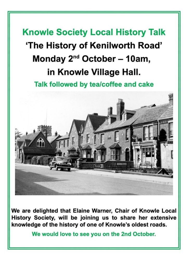 Local history talk – The History of Kenilworth Road – Monday 2nd October 10am in Knowle Village Hall10 September 202322 September 2023Talks Post Views: 906 previousJust Gems : Talk on Monday 18th SeptembernextKNOWLE SOCIETY ANNUAL QUIZ : Monday 16th October
